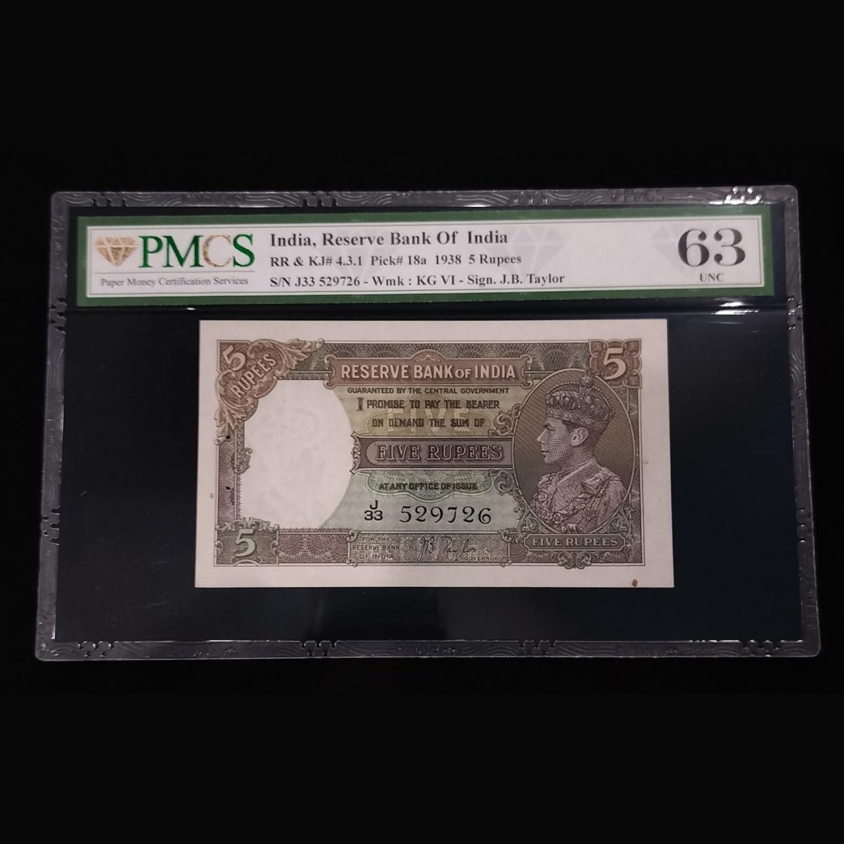 Dive into history with this authentic British 5 Rupee Note signed by J.B. TAYLOR, PMCS graded 63, with the serial number J/33 529726. Issued by the British authority, this collectible piece showcases a unique blend of historical significance and numismatic value. The note bears the signature of J.B. TAYLOR, adding a touch of personal connection to its story.