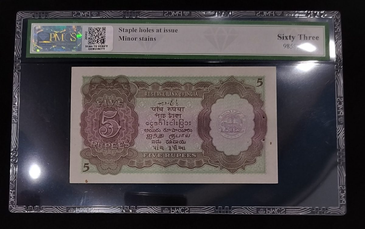 This 5 Rupee Note carries a piece of British colonial history, offering a glimpse into a bygone era. With its PMCS grade of 63, this note stands out for its remarkable preservation and quality. The serial number J/33 529726 further enhances its collectible appeal, making it a sought-after item among enthusiasts.