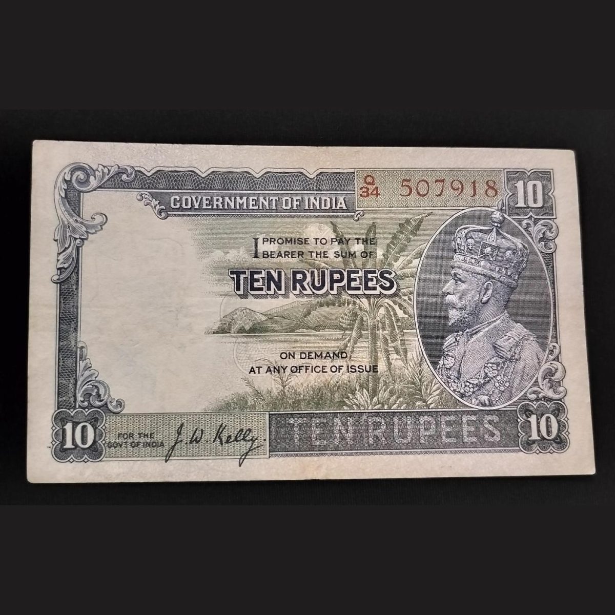 British India 10 Rupees George V Third Issue Signed By J.W.Kelly Serial no Q/34 507918 GEM UNC
