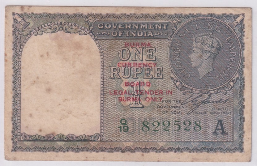 British India Burma Overprint 1 Rupee 1940 CE Jones Signature Very Fine Note #5