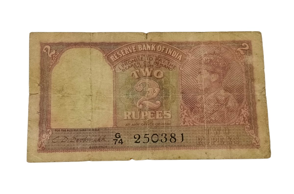 Step back in time with this remarkable British India TWO RUPEES banknote featuring the signature of C.D. Deshmukh and the portrait of King George VI. Issued in the early 20th century, this collectible piece holds historical significance as a relic from the British colonial era in India. The banknote’s denomination of 2 Rupees showcases intricate detailing and elegant design, reflecting the craftsmanship of that period.