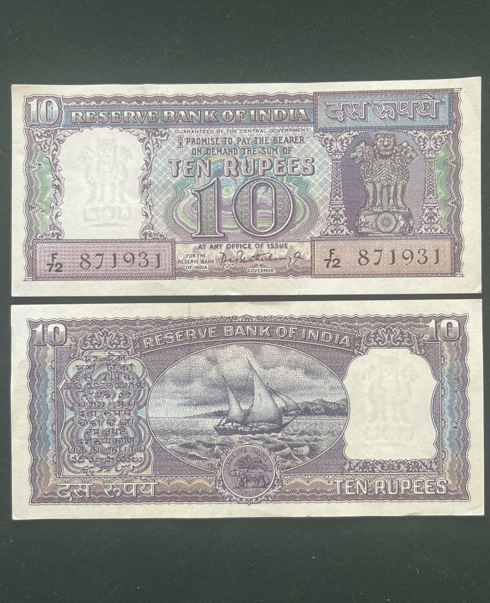 D9 – Rs 10 India Banknote Signature series Signed by PC BHATTACHARYA Inset PLAIN 1967 Issue