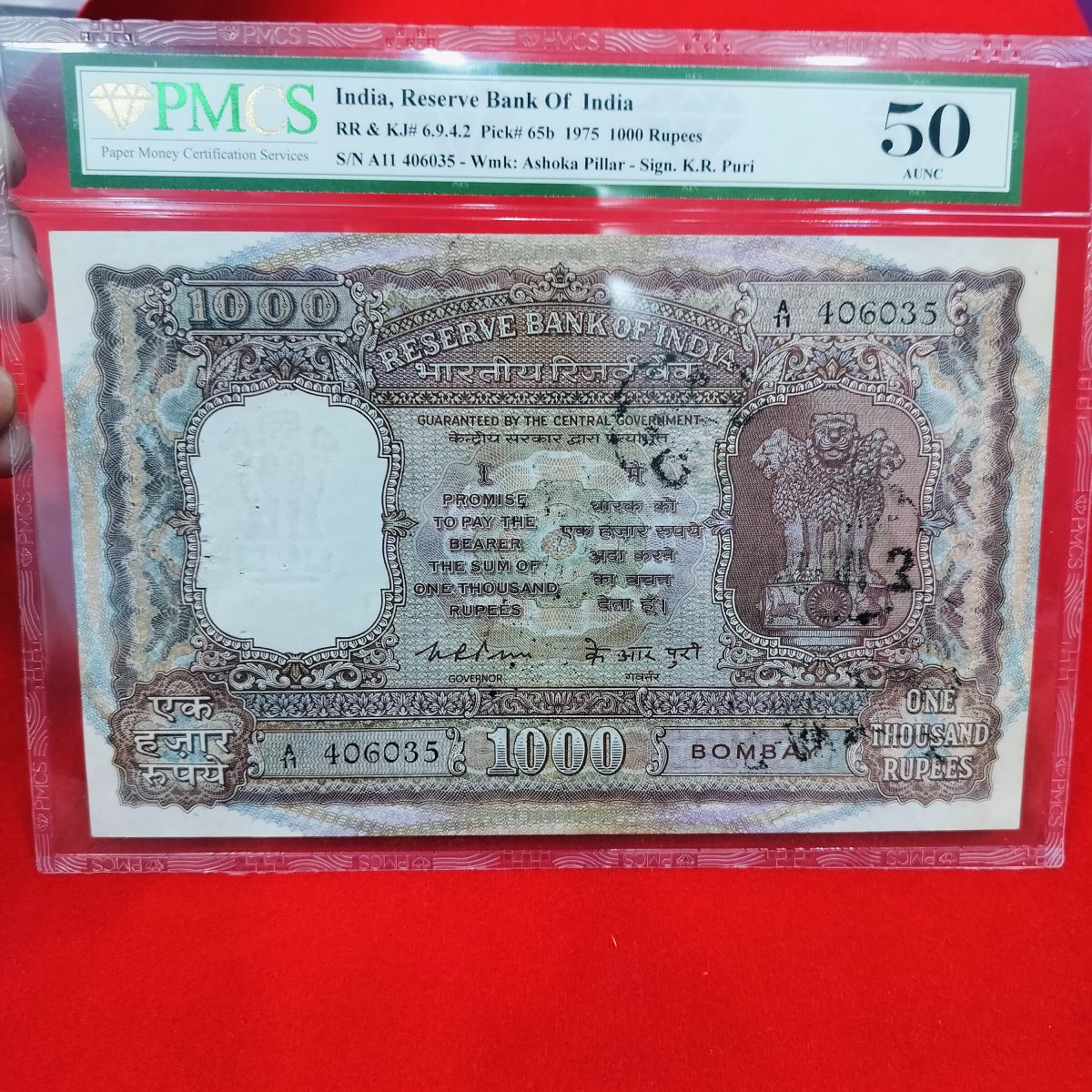 EXTREMELY RARE 1000 RUPEE K.R PURI AUNC GRADED 50
