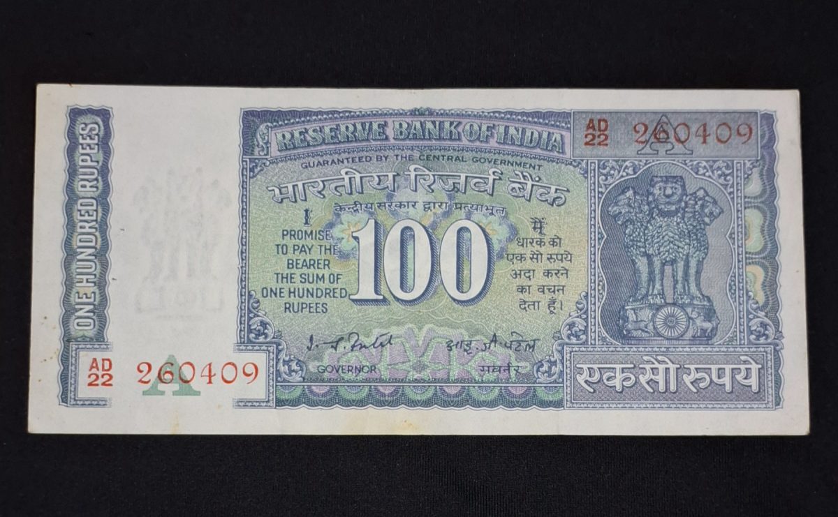 G-16 100 RUPEE NOTE I.G. PATEL DAM ISSUE SERIAL NO. 260409