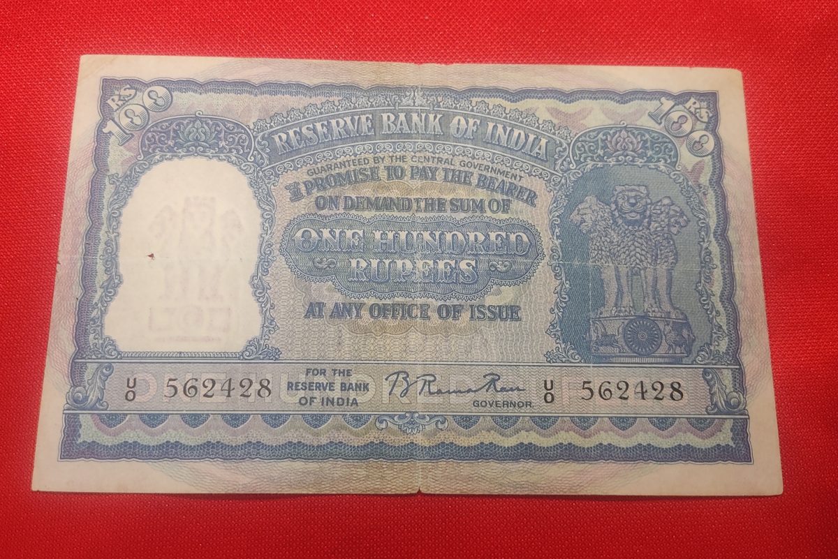 HUNDRED RUPEES NOTE G1 B. RAMA RAU KANPUR ISSUE U PREFIX SERIEL NUMBER 562428