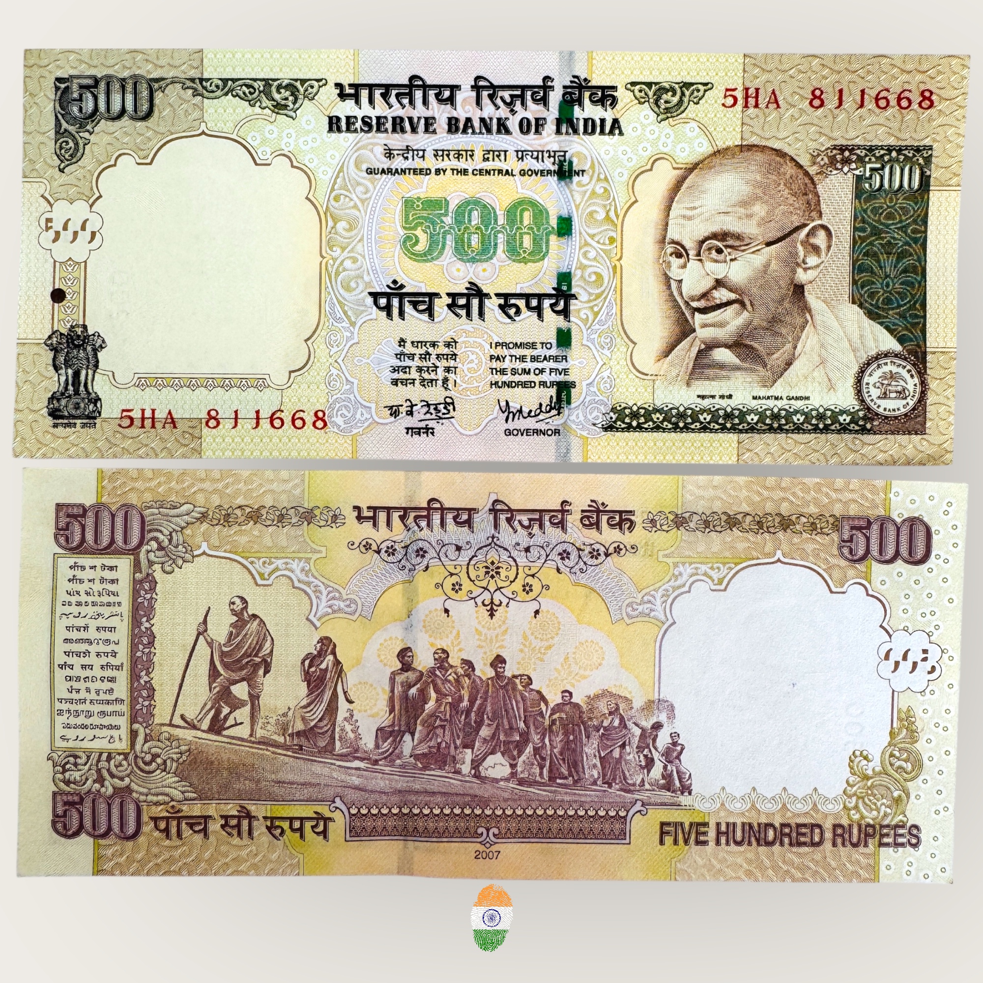 I23 Rs 500 India Banknote Signature Series Signed by Y V Reddy Inset Plain 2007 Issue UNC Unique and Rare