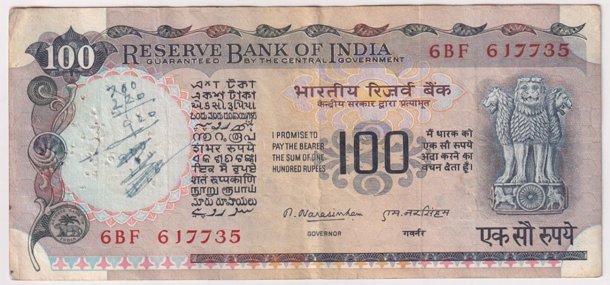 India Cobalt Issue 100 Rupees M Narasimham Ex Rare Note #1