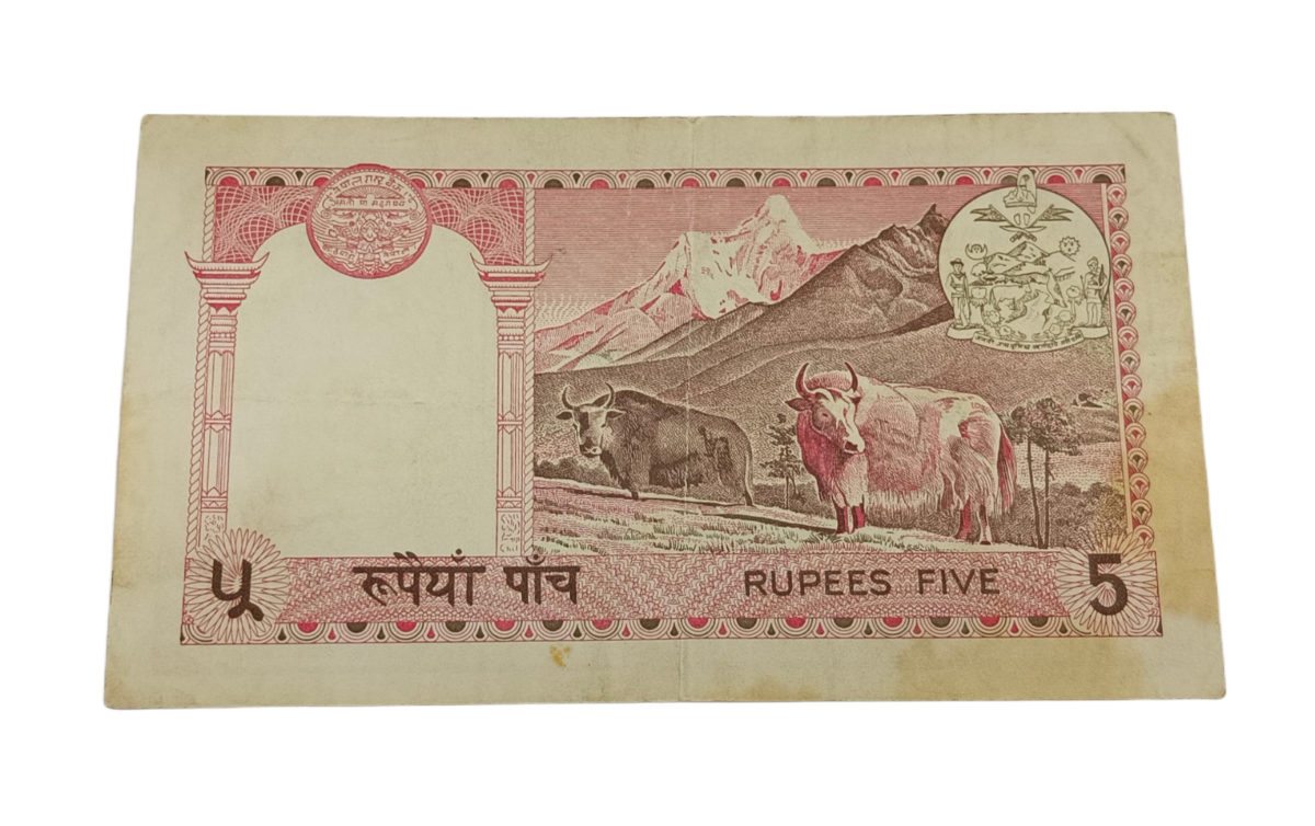 NEPAL Old Issue 5 RUPEES “Pink Color” KING Portrait Two YAAKS Back **RARE** Collectable Grade.