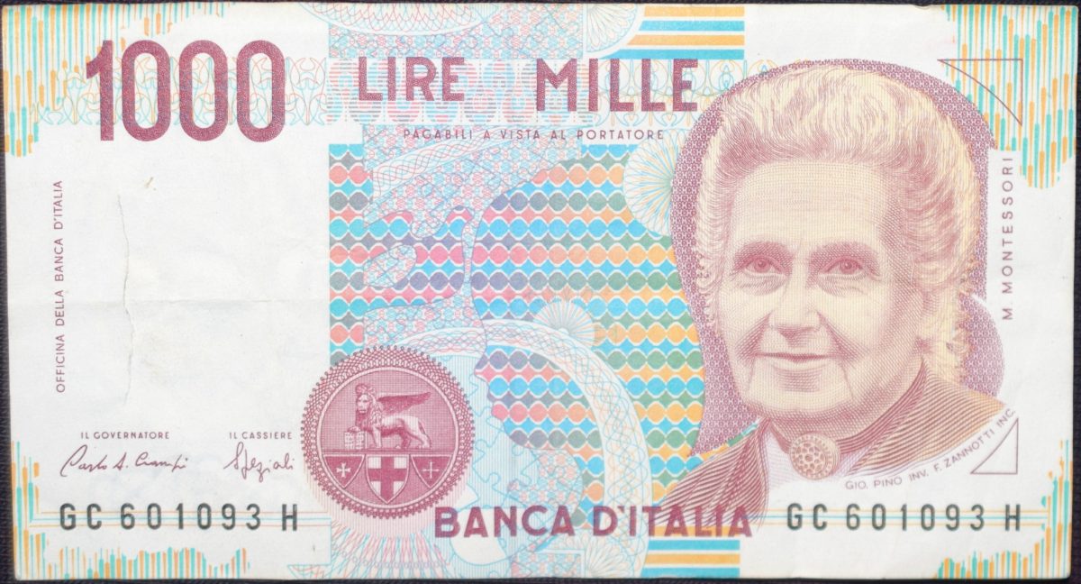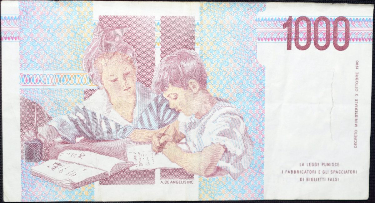 Old 1000 Lire of Italy Country (AD 1990-2001) with Painting “Bambini allo studio” (Children in the studio)
