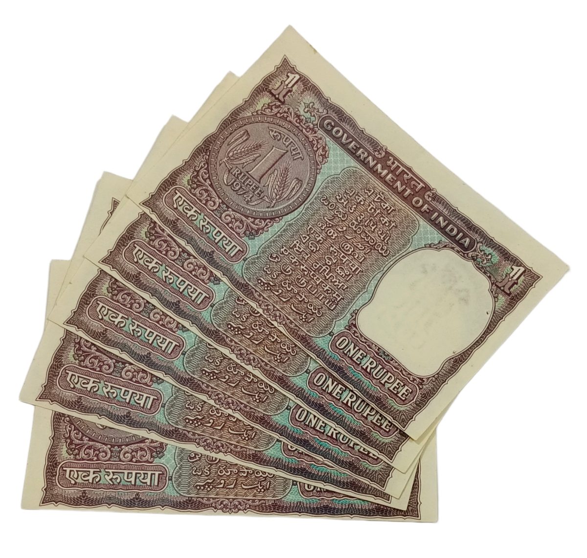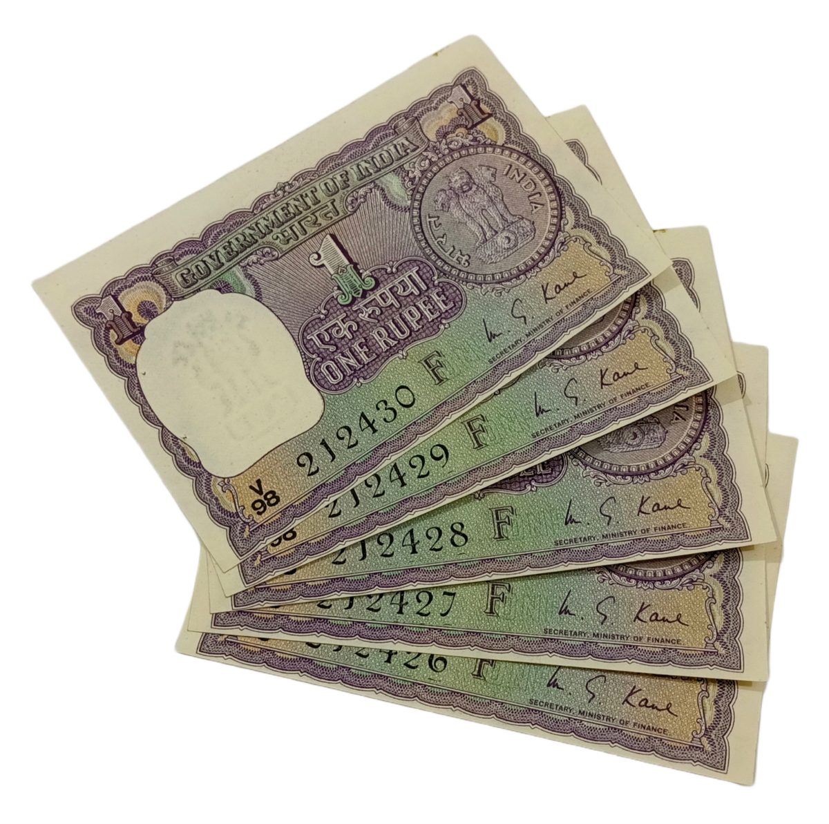 One Rupee Old BIG COIN Year 1974 Sign M.G KAUL Serially 5 Notes CUTTING//SHIFTING Error **SCARE** UNC Grades.