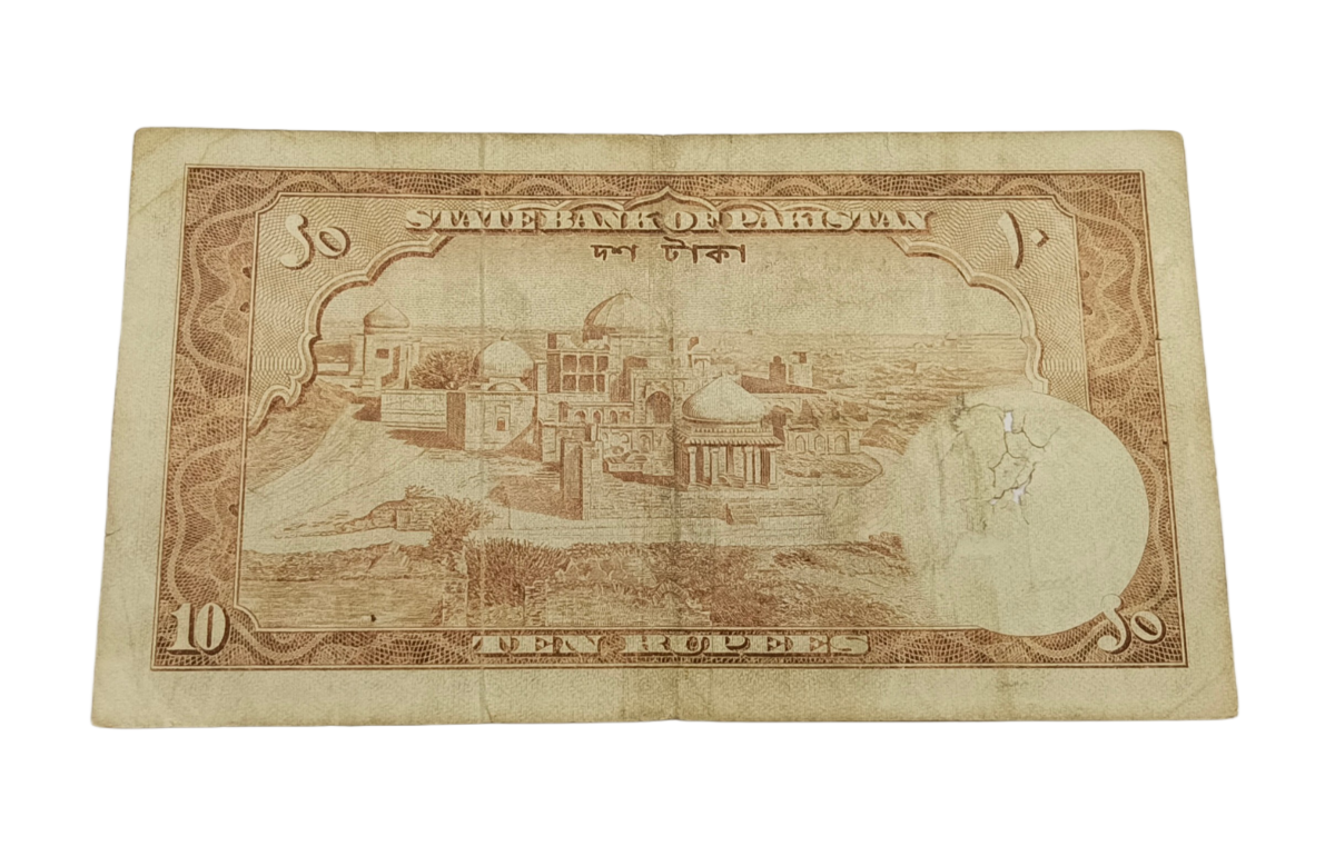 Uncover a piece of history with the PAKISTAN Old 10 RUPEES First Series STATE BANK OF PAKISTAN “Big Size” King/Queen Issue SHALIMAR GARDEN LAHORE Note. This rare collectible, minted at the Lahore Mint, features a denomination of 10 Rupees and showcases the iconic Shalimar Garden in Lahore. Issued in a larger size, this note stands out as a unique and sought-after item for collectors and enthusiasts alike.