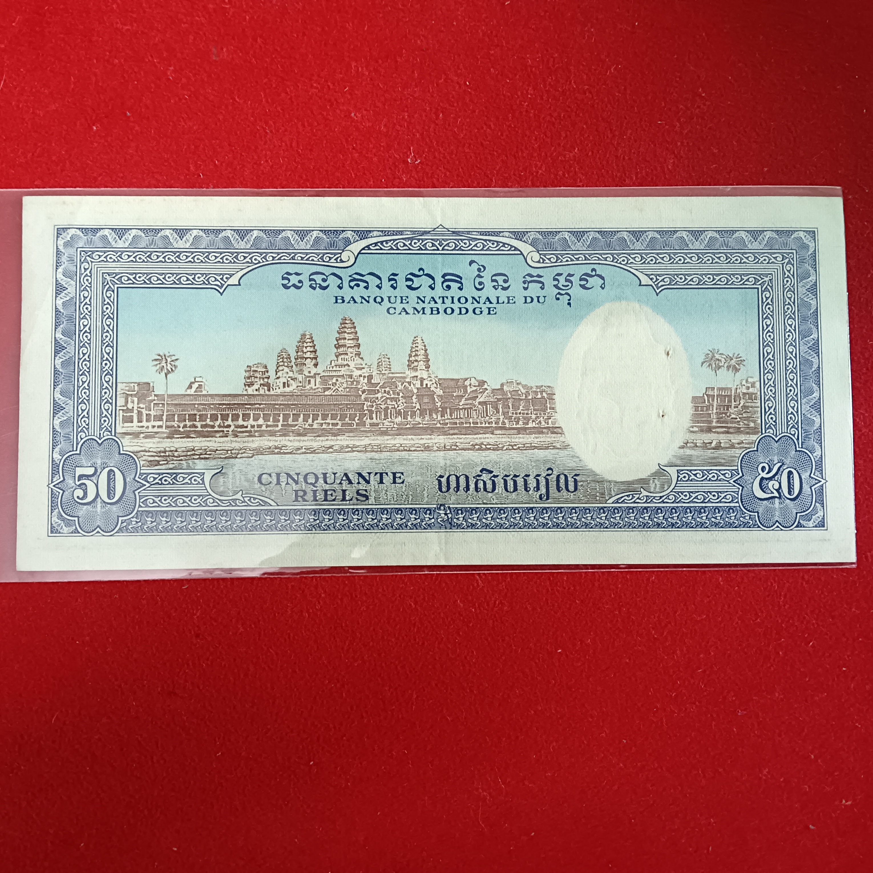 - 50 Riels banknote issued between 1956 and 1974. The reverse side, as shown in the image, features the Angkor Wat temple complex.