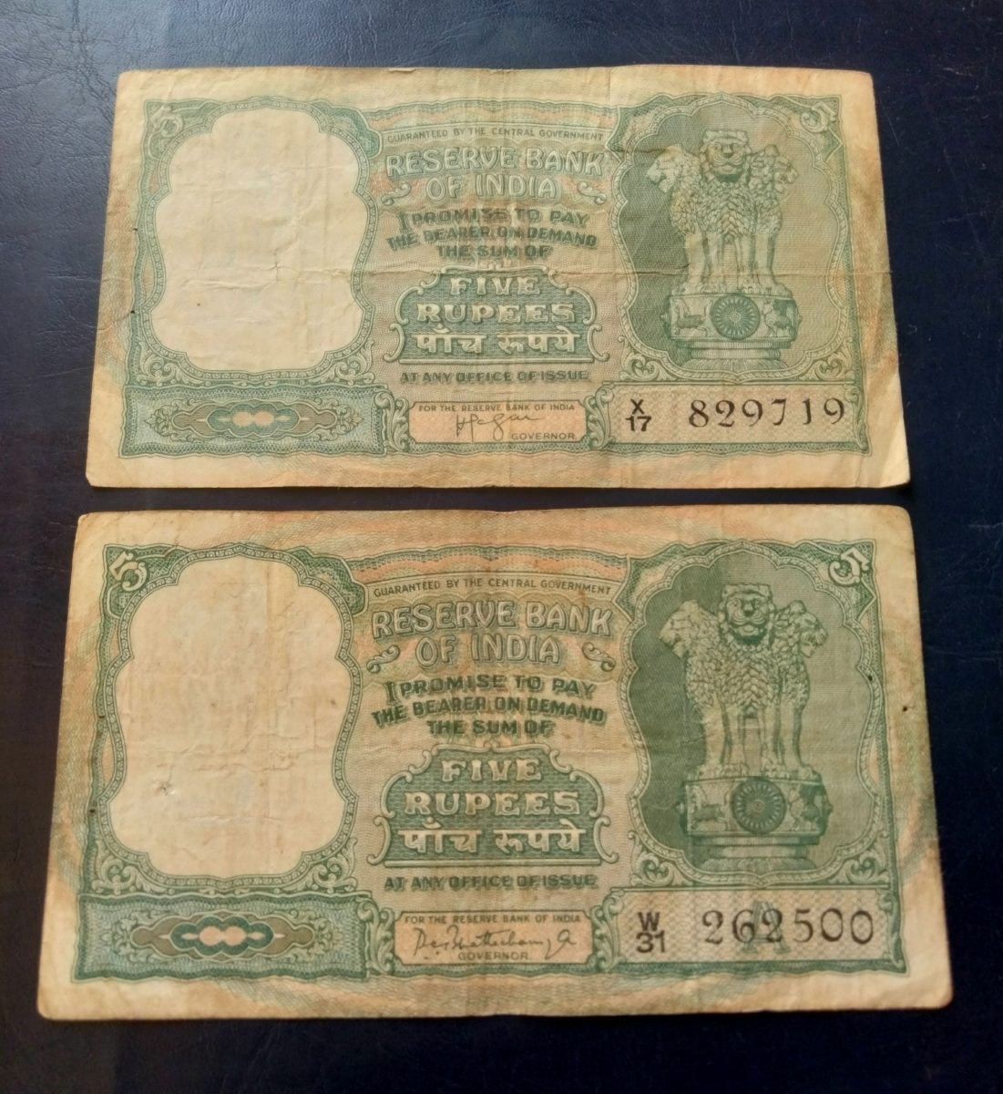 Reserve Bank of India 2 different signature 5 ruppee notes Hvr. IYENGAR and PC. Bhattacharya Back side deer six Excellent condition rare note Same and similar piece available