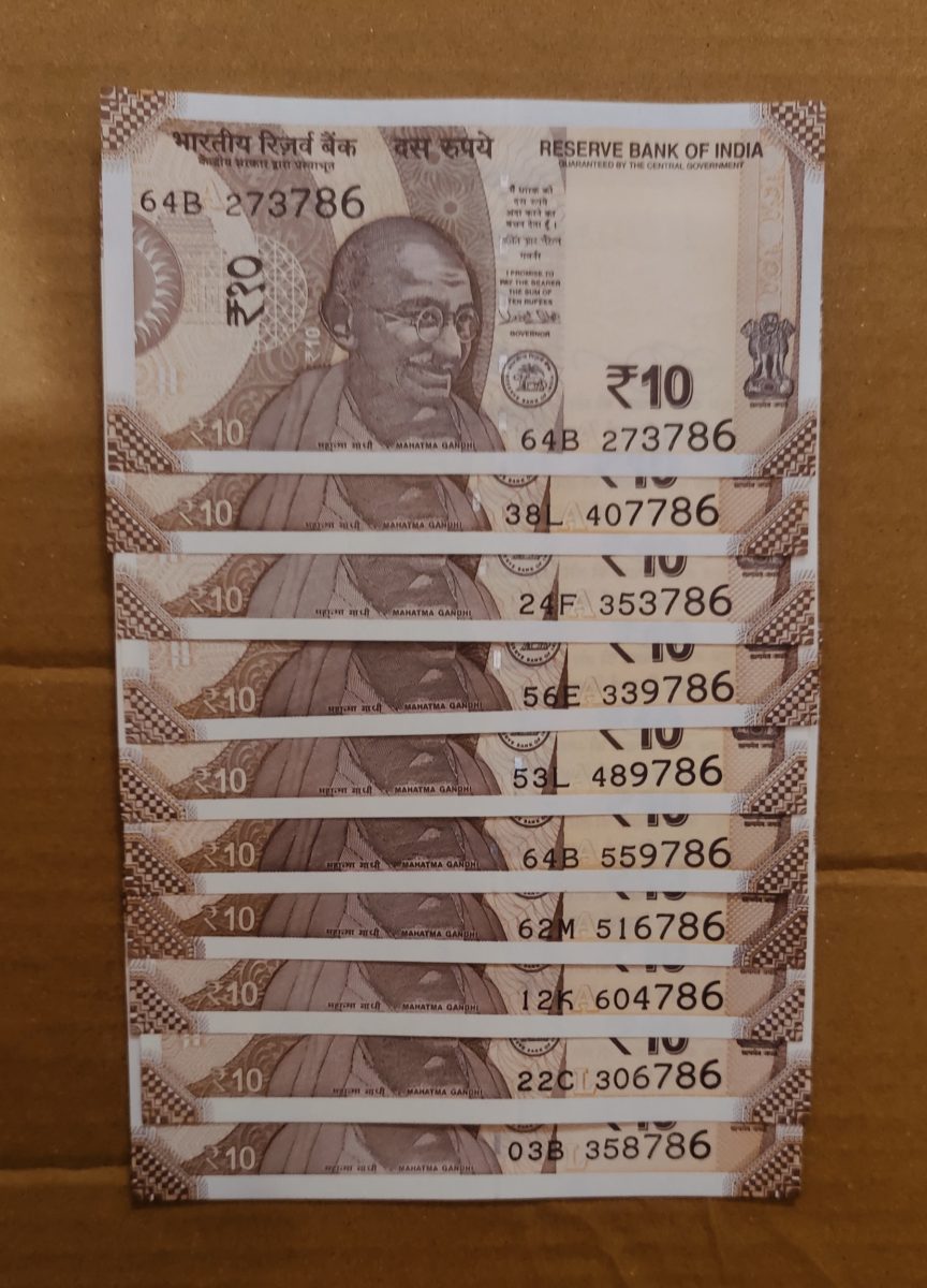 Reserve Bank of India Rs 10 note. Ending 786 Excellent condition. 10 piece given Same and similar piece available