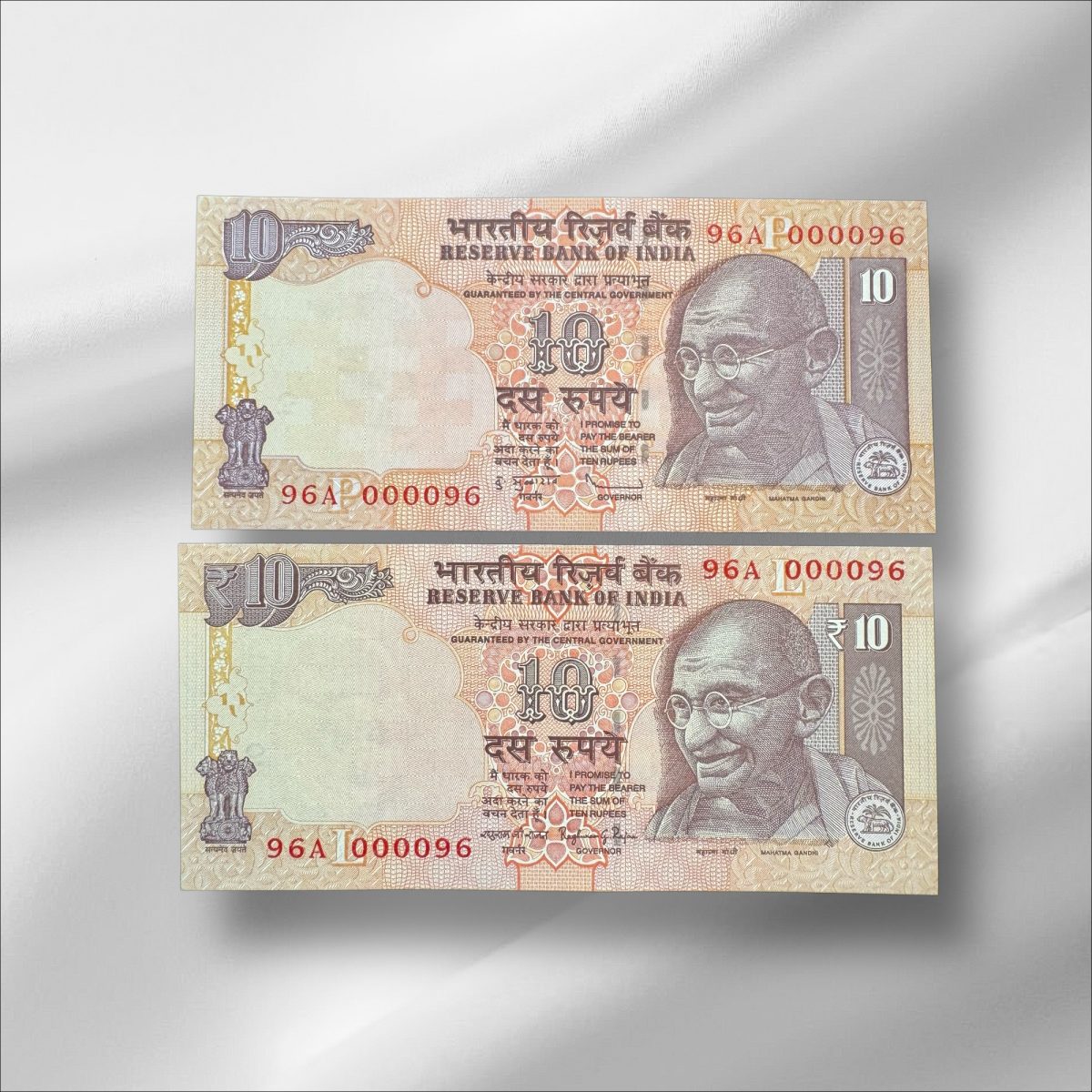 RS 10/- Fancy Number TWIN SET Issue 96A 000096 Gem UNC Unique and Rare