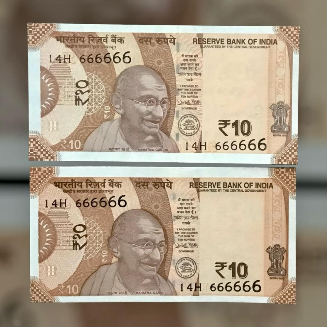 Rs 10 INDIA Banknote SEMI FANCY TWIN SET 14H 666666 UNIQUE AND RARE