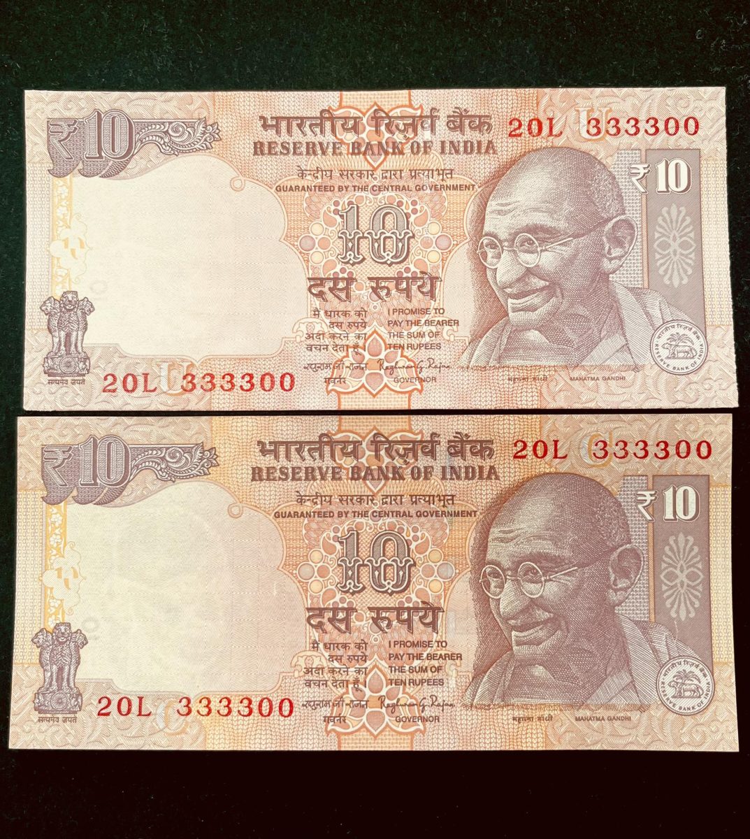 The Rs 10 INDIA Banknote SEMI FANCY TWIN SET 20L 333300 is a unique and sought-after collectible item that comprises a pair of identical Rs 10 banknotes from India. Both notes share the same serial number, prefix, and denomination, making them a rare find for collectors. Issued by the Reserve Bank of India, these banknotes showcase intricate designs and historical significance, reflecting a piece of India’s economic history.