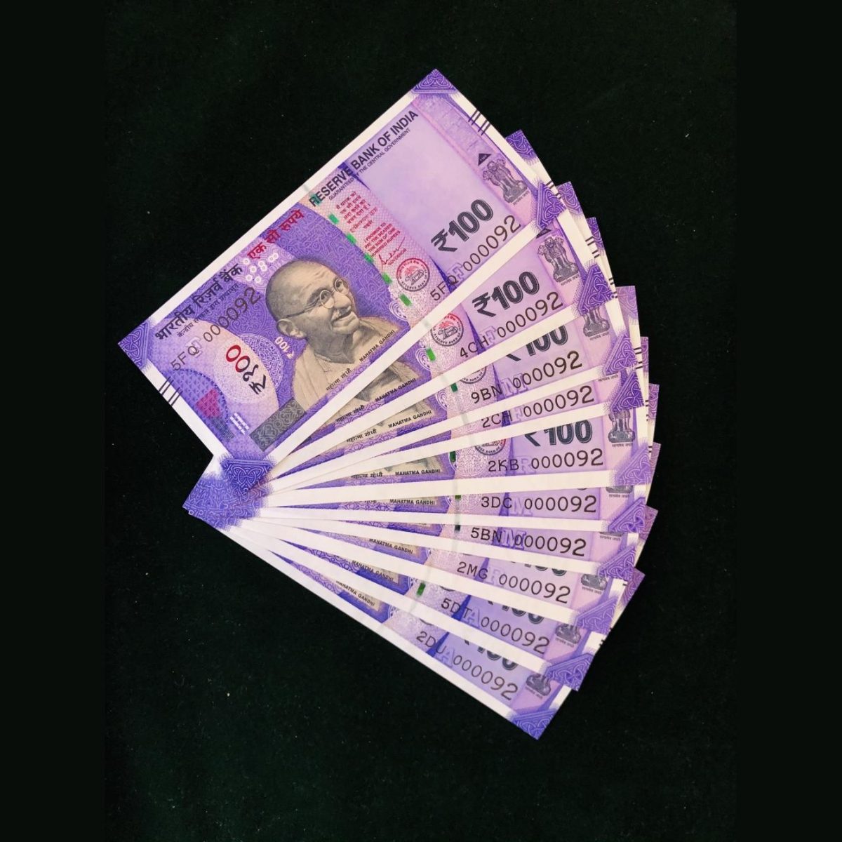 Rs 100 India Banknote Issue Low serial Number Set of 10 Notes Low Serial 000092 GEM UNC Unique