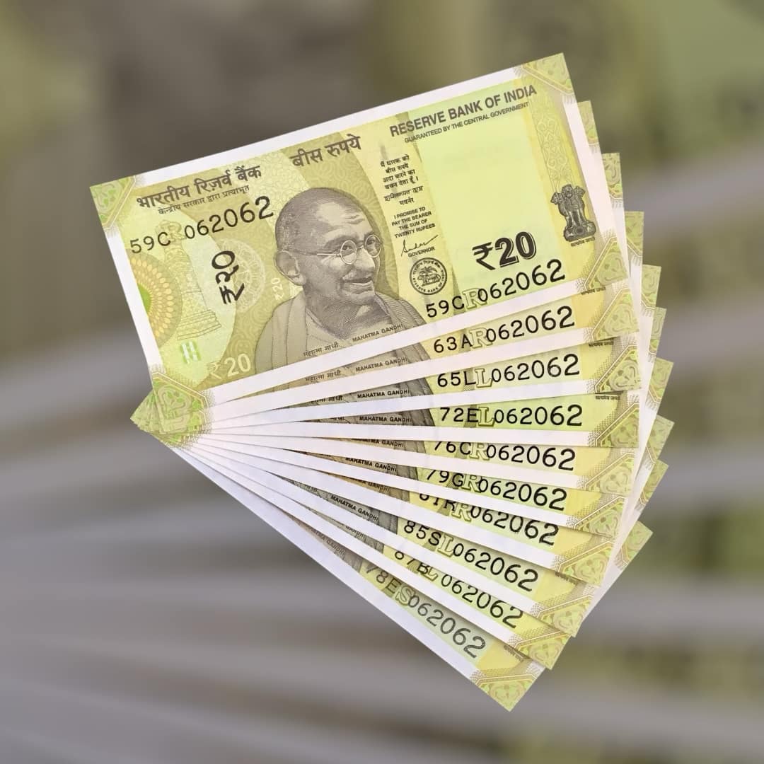 RS 20 INDIA BANK NOTE SEMI FANCY 10 NOTE SAME NUMBER SETS 062062 UNIQUE AND RARE