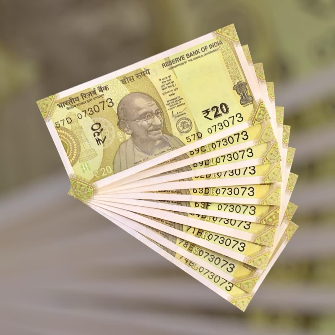 RS 20 INDIA BANK NOTE SEMI FANCY 10 NOTE SAME NUMBER SETS 073073 UNIQUE AND RARE