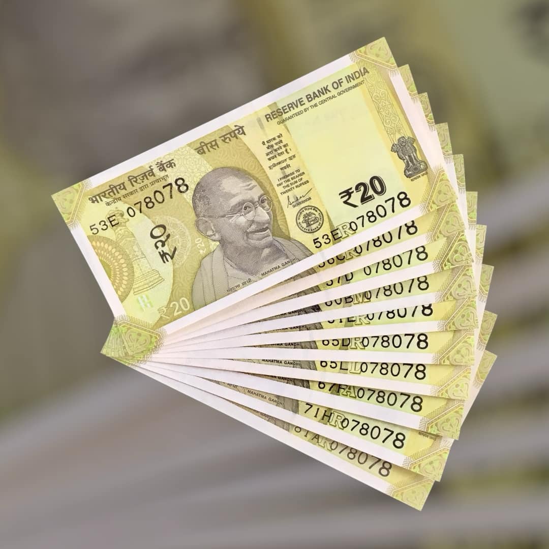 RS 20 INDIA BANK NOTE SEMI FANCY 10 NOTE SAME NUMBER SETS 078078 UNIQUE AND RARE