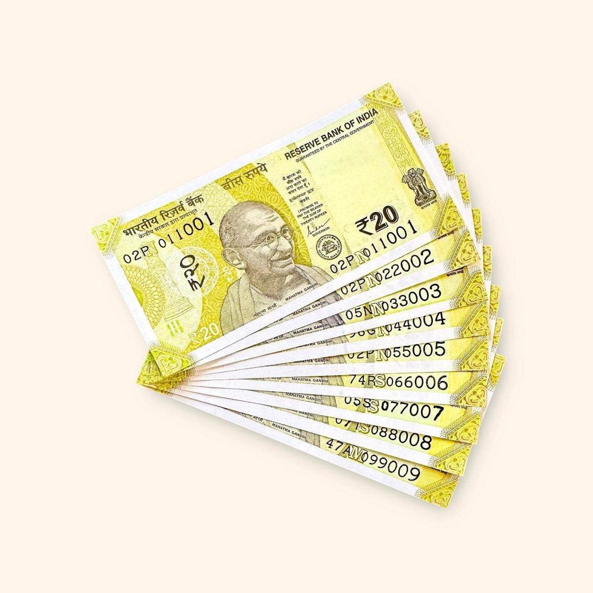 Rs 20 India Banknote Fancy Number Set 011001 till 099009 Gem Unc Very Unique and Rare