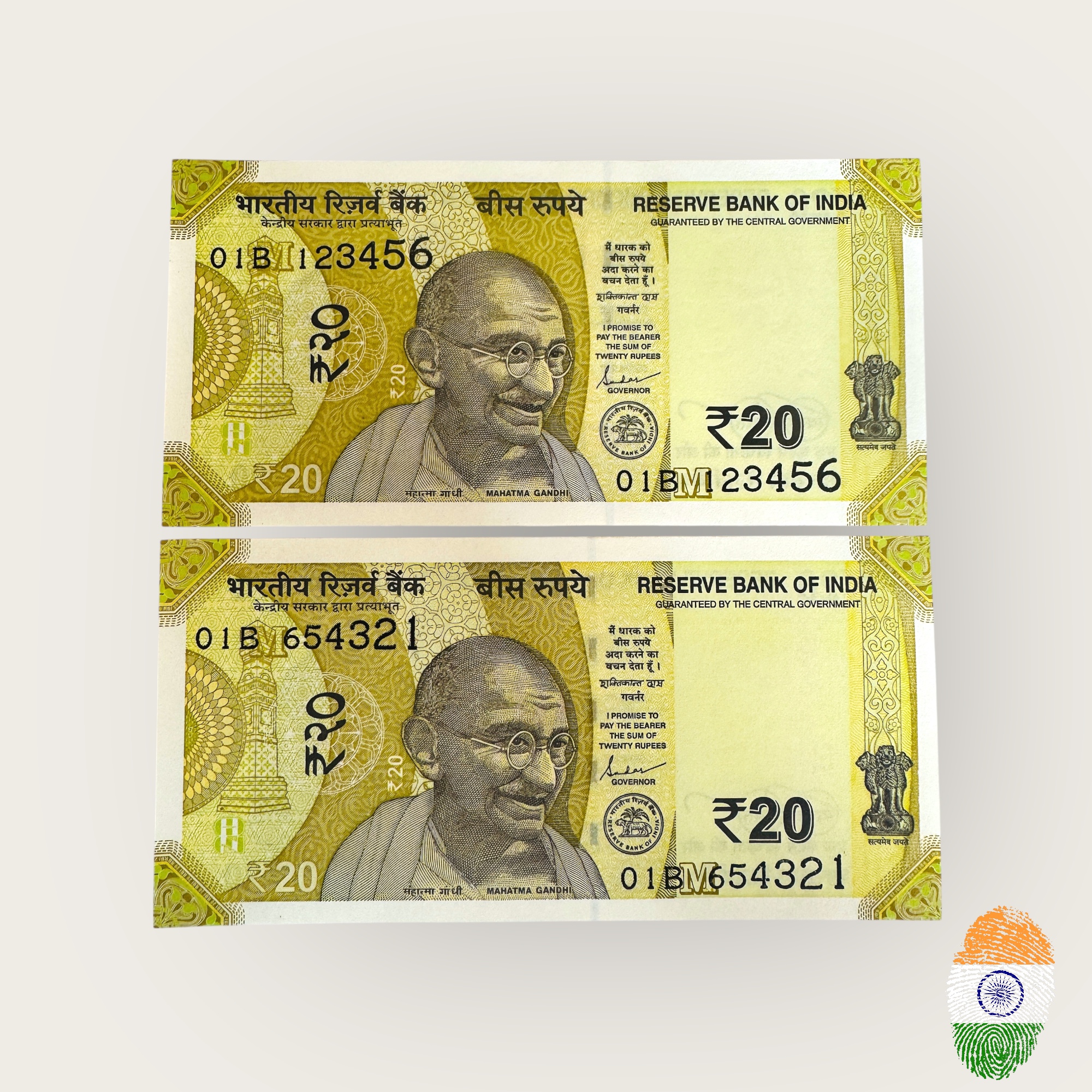 Rs 20 India Banknote Running Fancy Number Same Prefix 123456 and 654321 Unique and Rare
