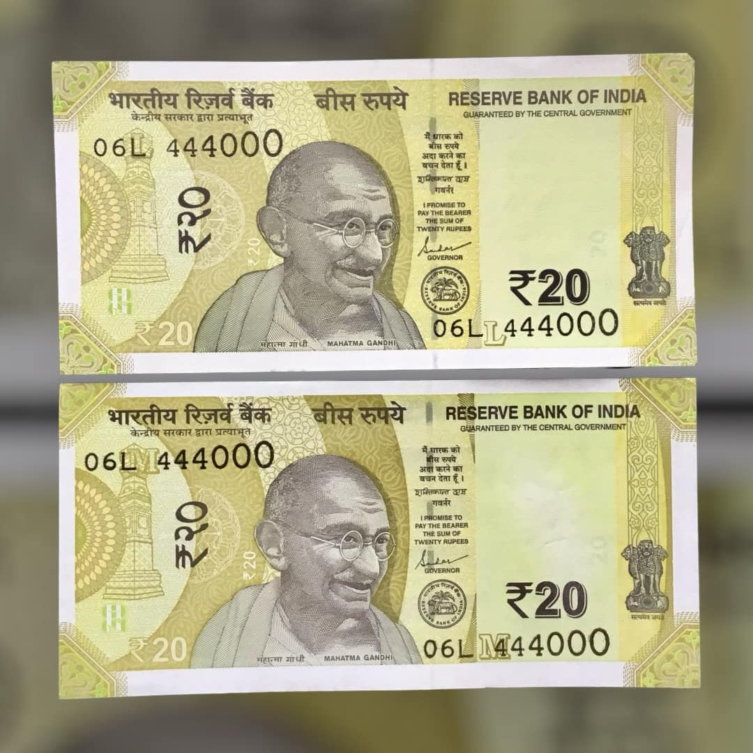 Rs 20 INDIA Banknote SEMI FANCY TWIN SET 06L 444000 UNIQUE AND RARE
