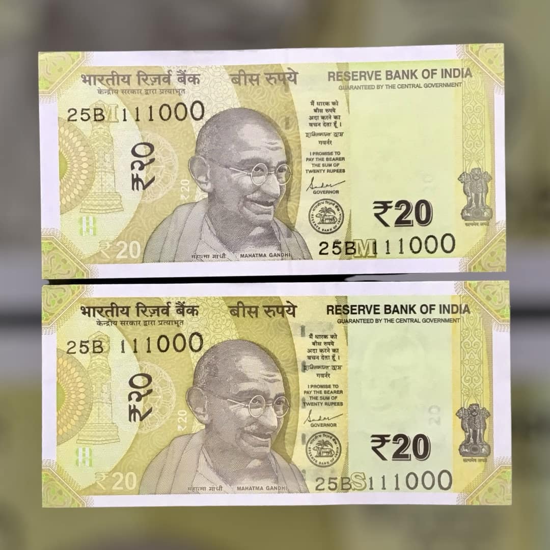 Rs 20 INDIA Banknote SEMI FANCY TWIN SET 25B 111000 UNIQUE AND RARE