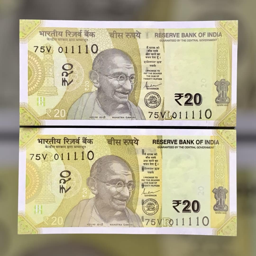 Rs 20 INDIA Banknote SEMI FANCY TWIN SET 75V 011110 UNIQUE AND RARE