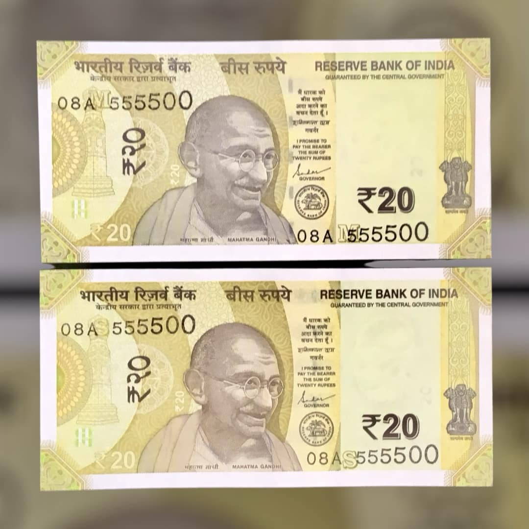 Rs 20 INDIA Banknote SEMI FANCY TWIN SETS 08A 555500 UNIQUE AND RARE