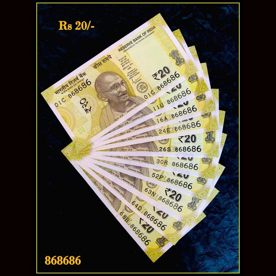 ✅ Rare set of 10 uncirculated Rs 20 India banknotes with unique serial number 868686