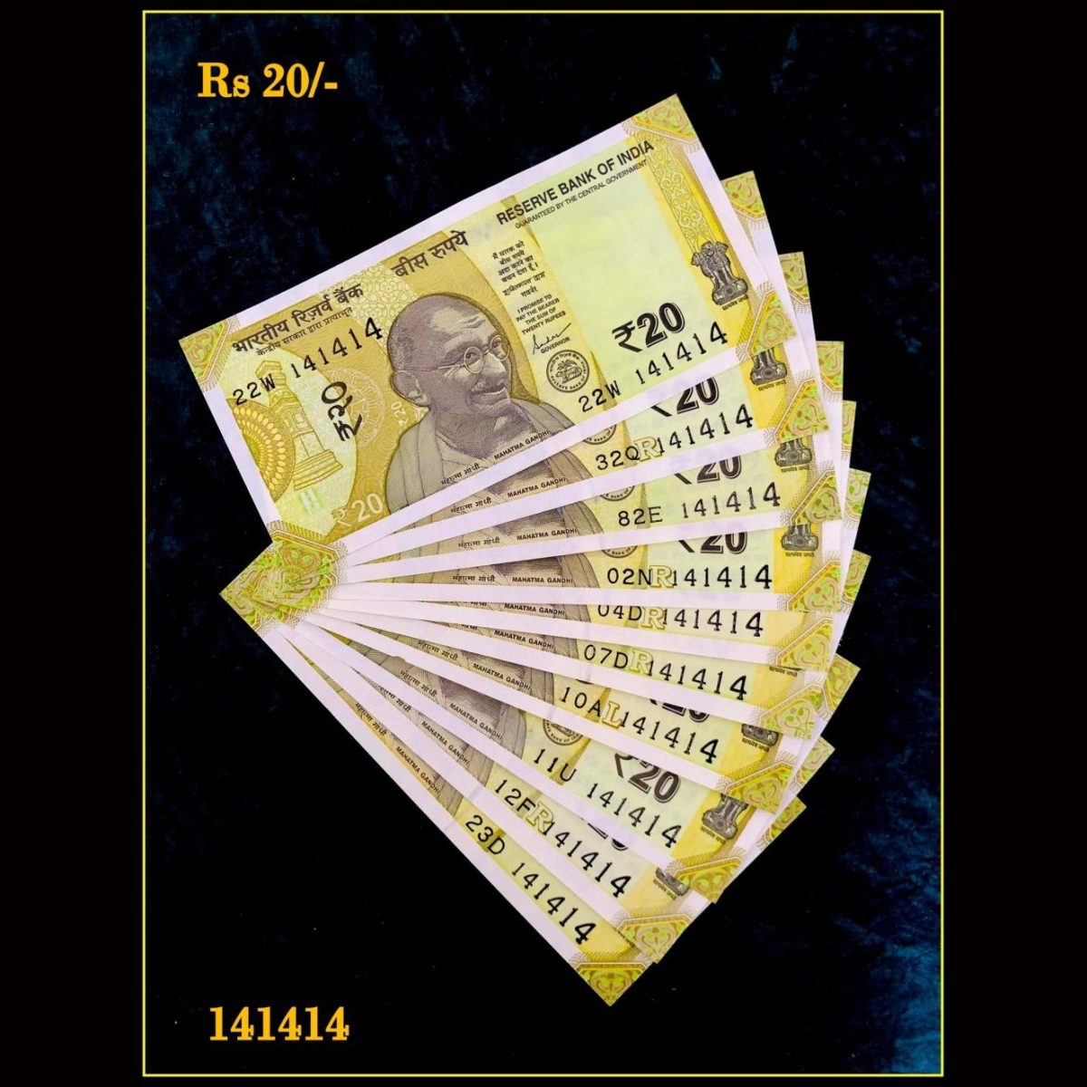Rs 20 India Banknote Tripling 10 Note Set Number 141414 GEM UNC Unique and Rare