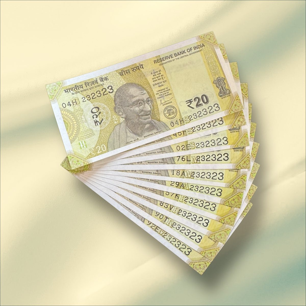 Rs 20/- India Banknote TRIPLING Number *10 Note Set Number 232323 Gem Unc Very Unique and Rare
