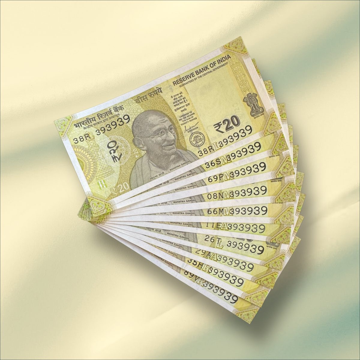 Rs 20/- India Banknote TRIPLING Number *10 Note Set Number 393939 Gem Unc Very Unique and Rare