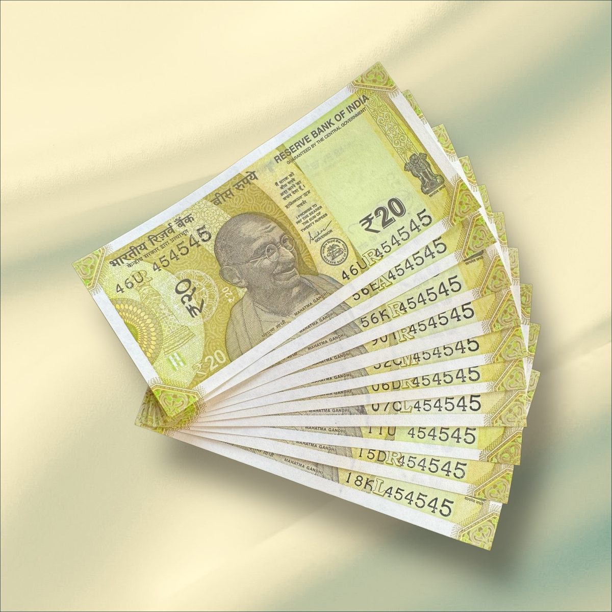 Rs 20/- India Banknote TRIPLING Number *10 Note Set Number 454545 Gem Unc Very Unique and Rare