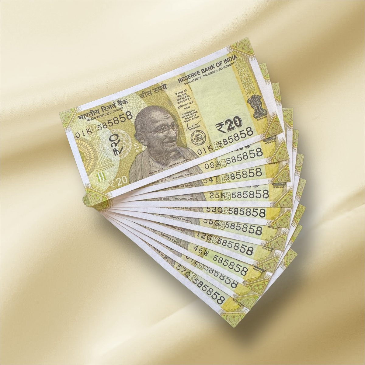 Rs 20/- India Banknote TRIPLING Number *10 Note Set Number 585858 Gem Unc Very Unique and Rare