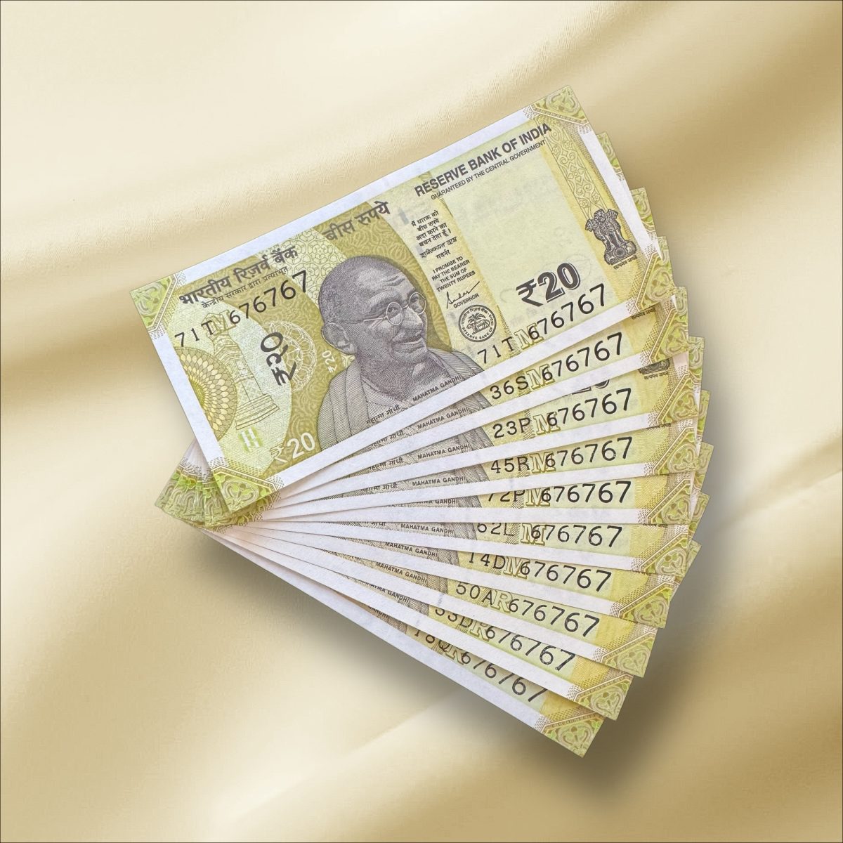 Rs 20/- India Banknote TRIPLING Number *10 Note Set Number 676767 Gem Unc Very Unique and Rare