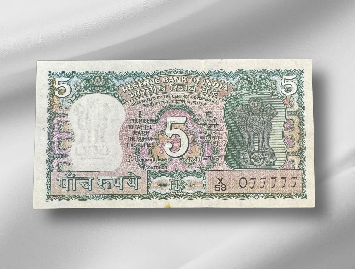 Step back in time with this exquisite collectible – the Rs 5/- Vintage India Bank Note Semi Fancy 077777 in Gem Unc condition. Issued by the Reserve Bank of India, this banknote is a true gem in the world of numismatics. Dating back to a bygone era, this piece of history showcases intricate details and unique semi fancy numbering, making it a rare find for any collector.
