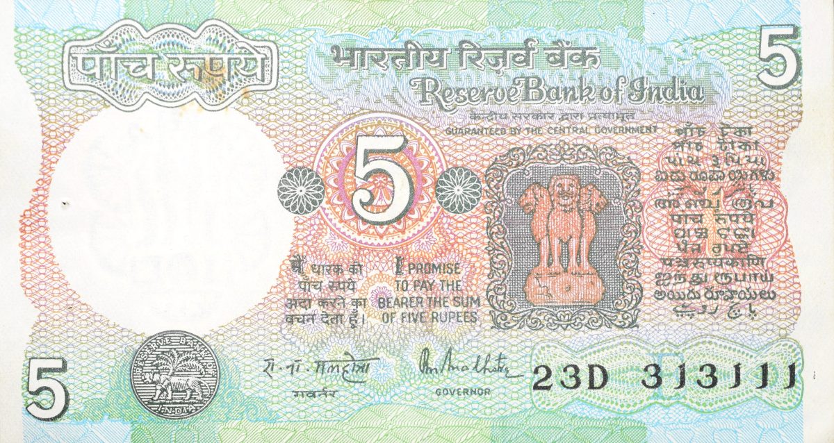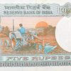 Semi-Fancy 5 Rupees of Republic India (AD 1985-1990) with Farmer ploughing with a tractor while sun is rising – R.N. Malhotra Signature ‘E’ Inset L Prefix