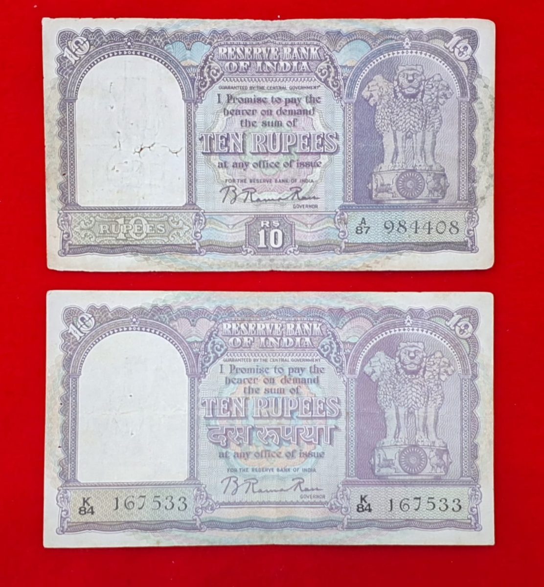 Ten rupees two notes D-2 D-3 governor B. Rama Rau serial no. 984408 , 167533