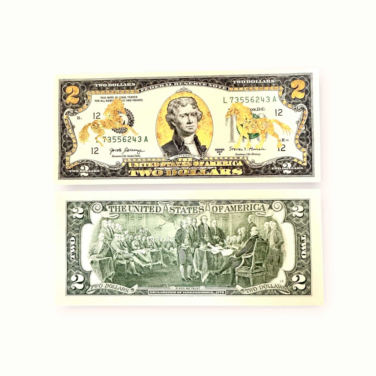 Step into the realm of numismatic enchantment with this exquisite USA 2 Dollar 24 Karat Gold Foil Plated collectible commemorating the Horse Year. Minted to perfection, this stunning piece features the iconic portrait of Thomas Jefferson on the front and the timeless “Declaration of Independence” painting by John Trumbull on the reverse. Crafted in gleaming gold, this UNC (NEW) condition bill embodies the spirit of freedom and intelligence associated with the Horse zodiac sign.