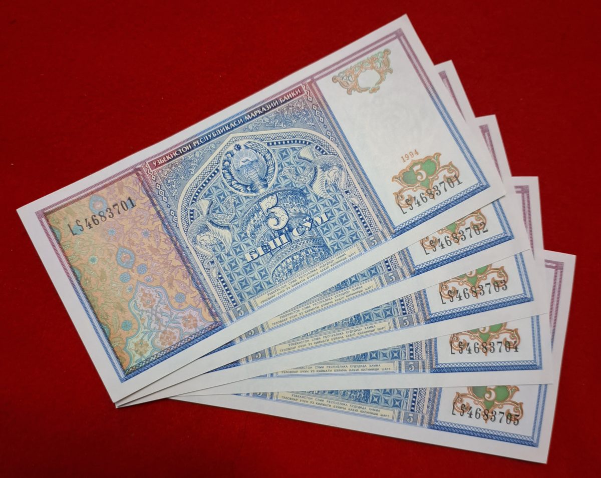 UZBEKISTAN 5 SOM GEM UNC CONDITION EACH NOTE PRICE 154
