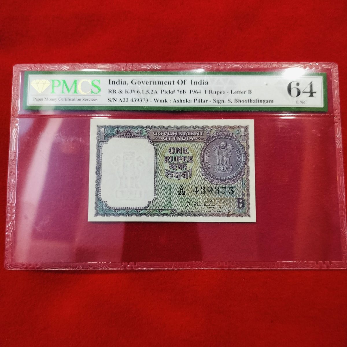 Extremely Rare PMCS 64 Graded One Rupee Banknote Signed by S. Bhoothalingam of Republic India of 1964