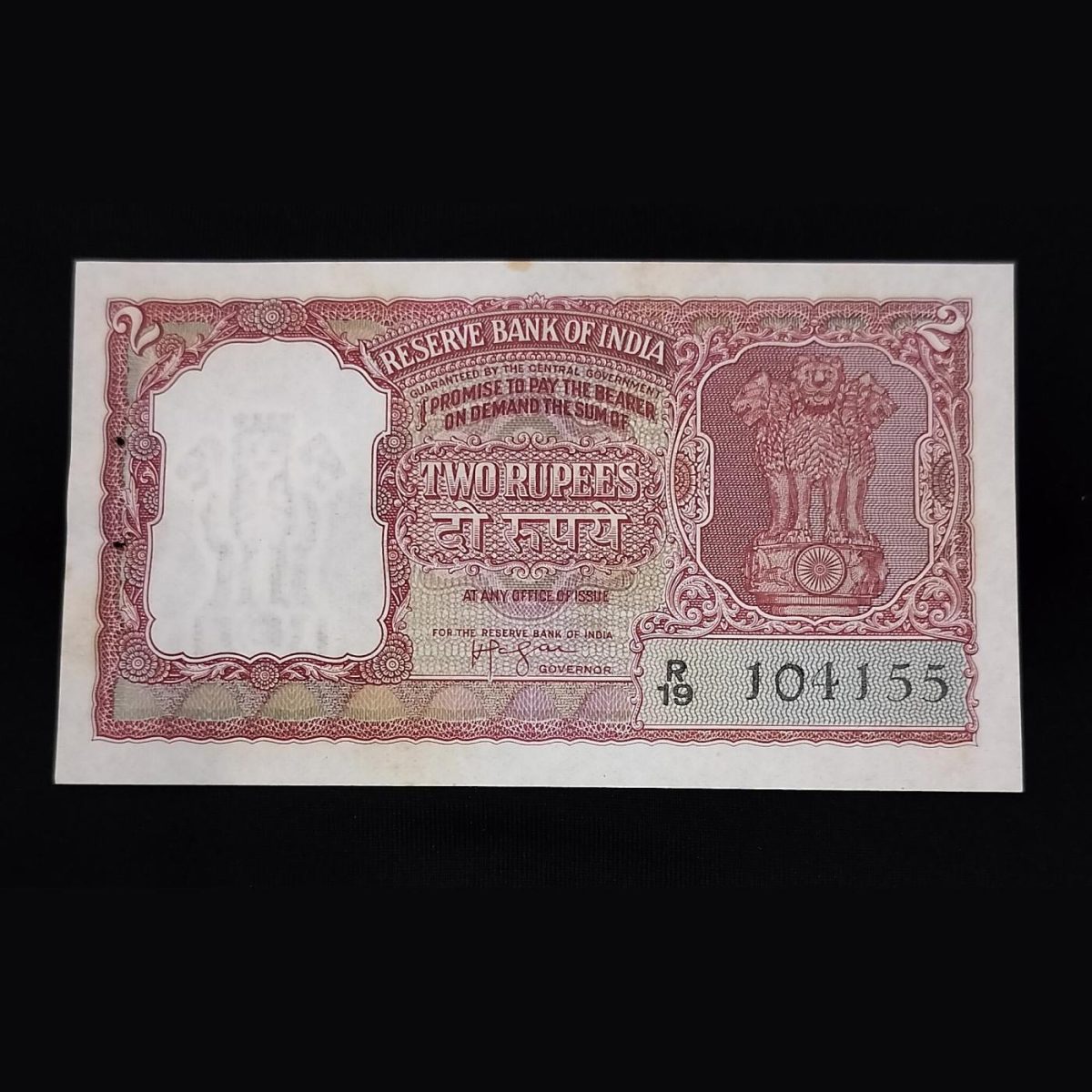 Very Rare TWO Rupee Red Half Tiger Note Serial no R/19 104155