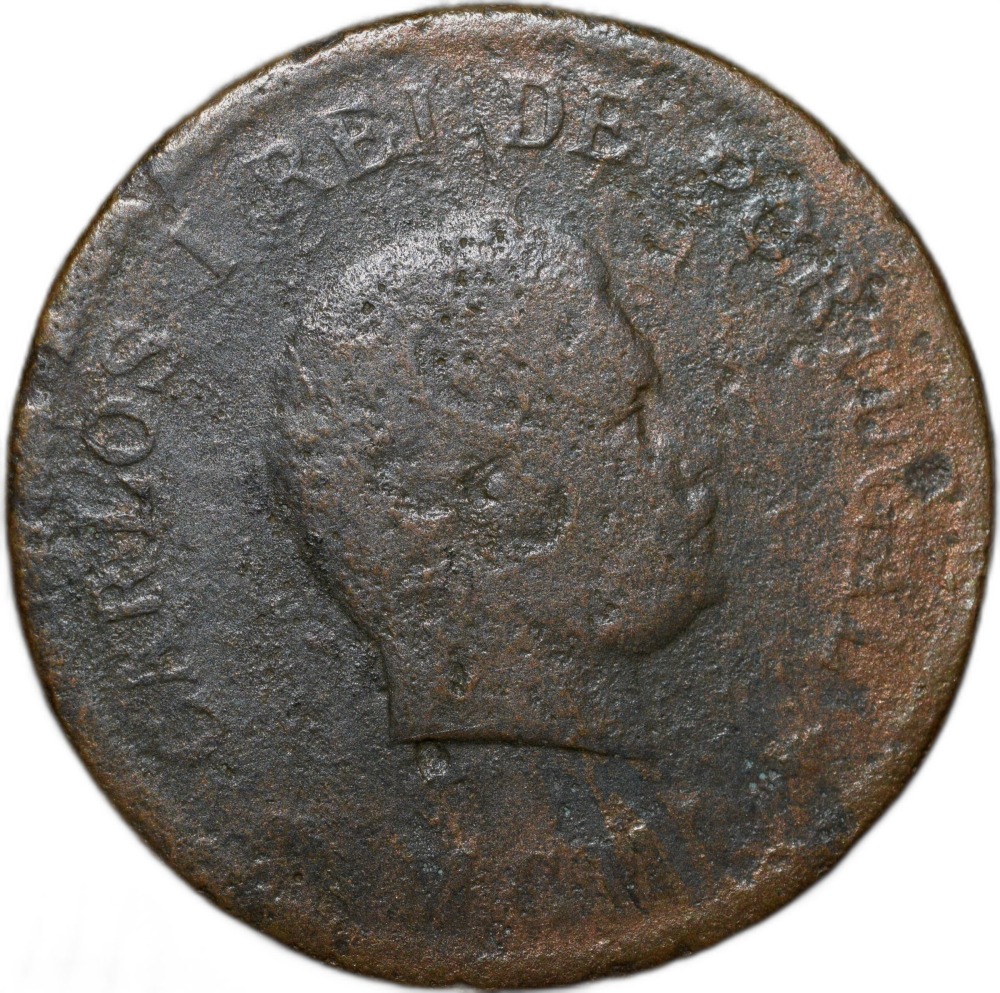 Indo-Portugal, Carlor I (AD1901), Copper 1/2 Tanga, Obv: Carlos I facing Right, Rev: Crown above Shield, Denomination, 11.10 Gms, 30.06 mm, About Fine, Scarce.