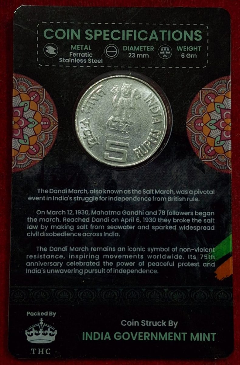 5 Rs. 75 YEARS OF DANDHI MARCH rare Commemorative Coin Card Special Edition