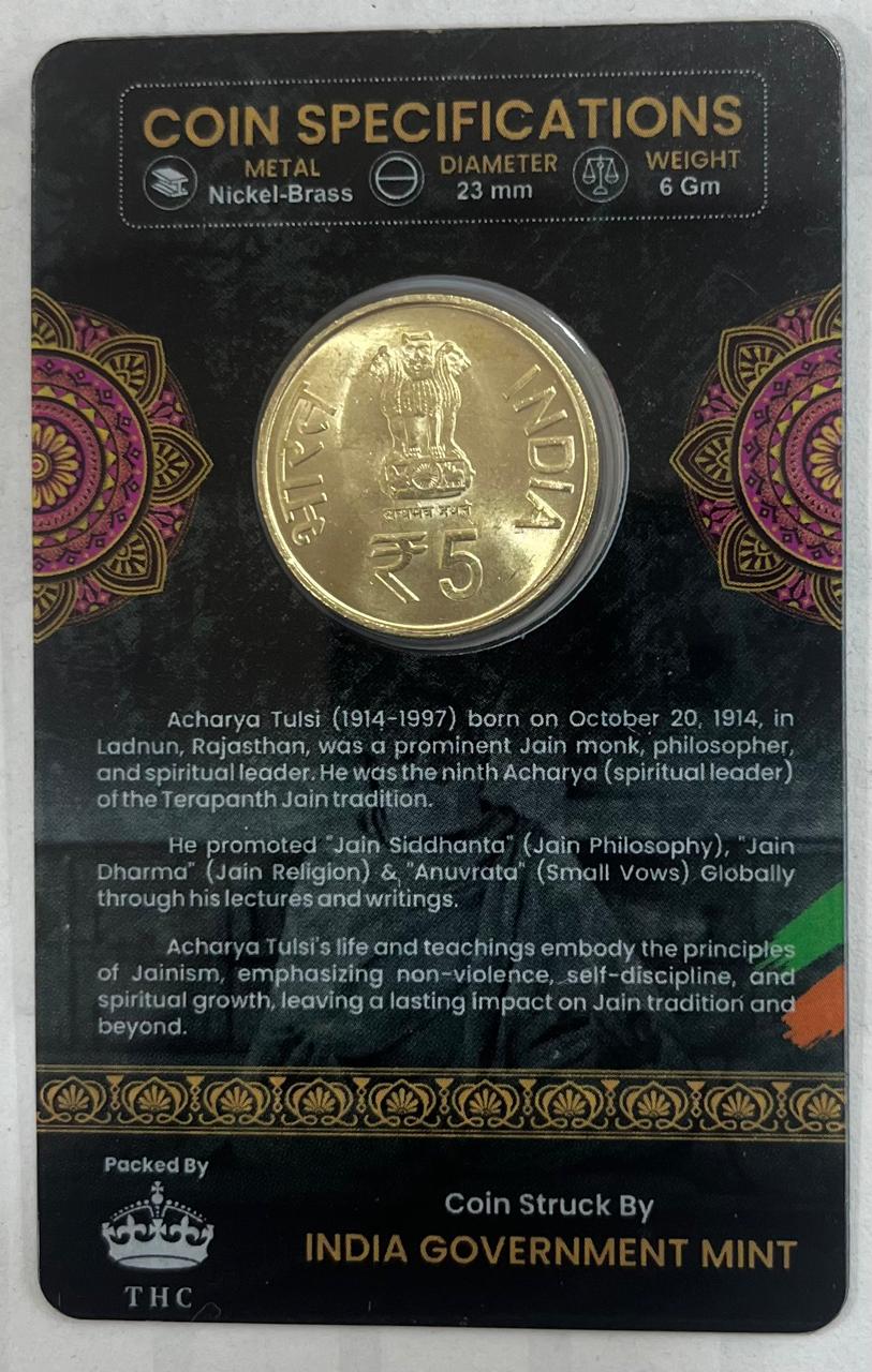 5 Rs ACHARYA TULSI COMMEMORATIVE ISSUE RARE COIN CARD SPECIAL EDITION