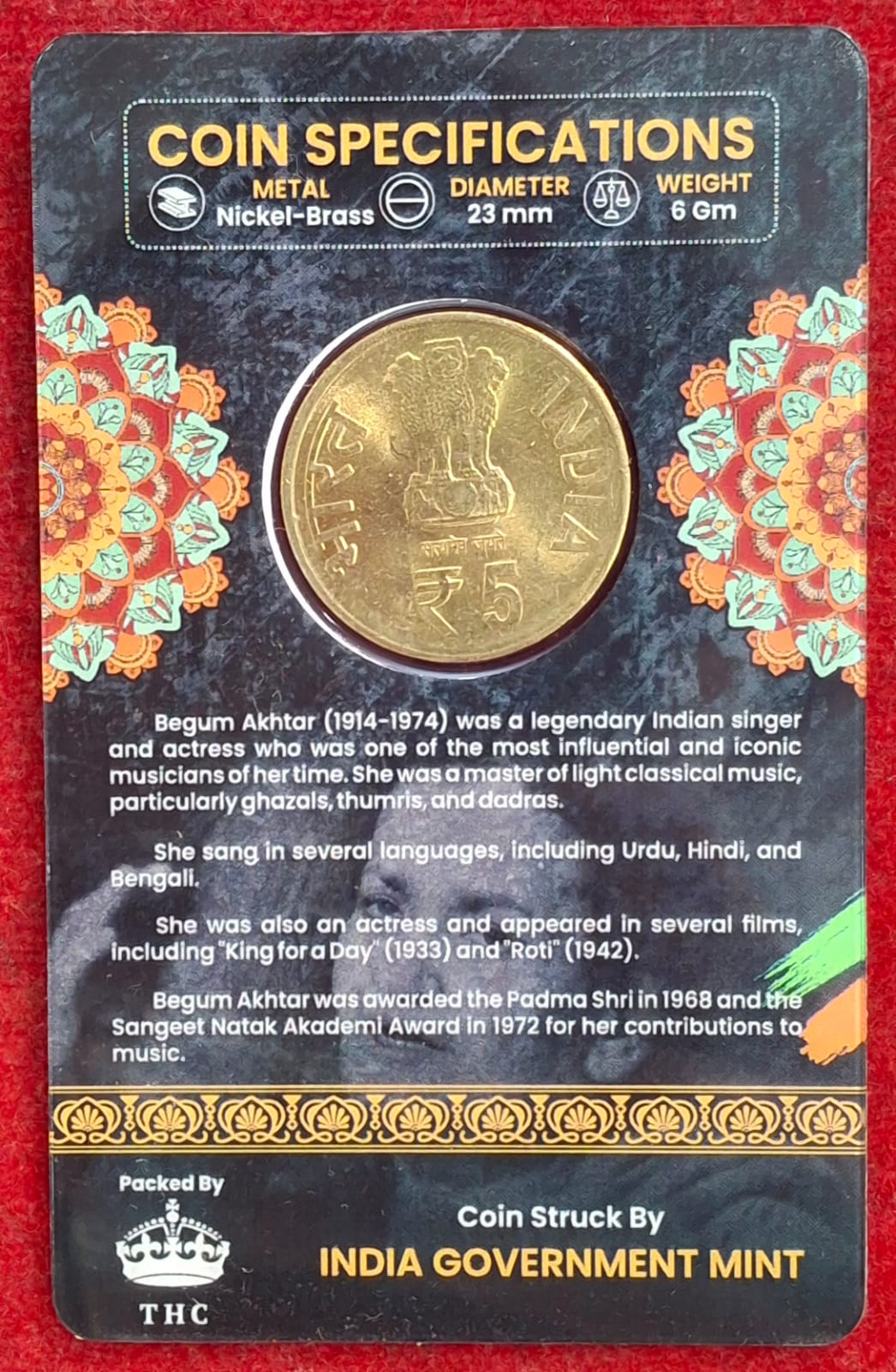 5 Rs. BEGUM AKHTAR rare Commemorative Coin Card Special Edition