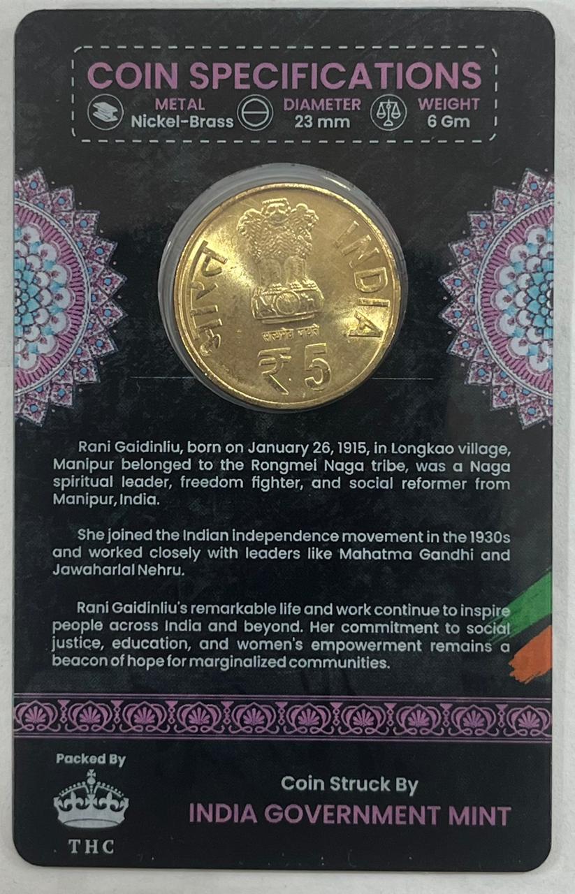 5 Rs BIRTH CENTENARY OF RANI GAIDINLIU COMMEMORATIVE ISSUE RARE COIN CARD SPECIAL EDITION
